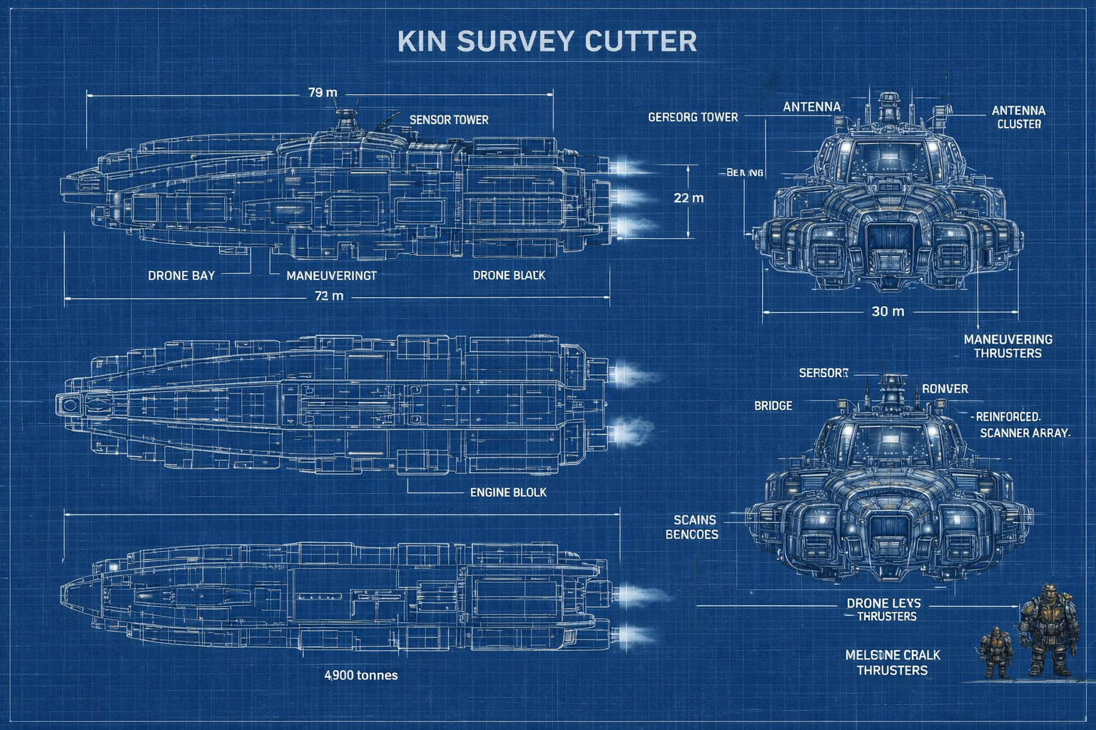 Each Survey Cutter operates with a crew of nine Kin, composed of both Ironkin and biological Kin.