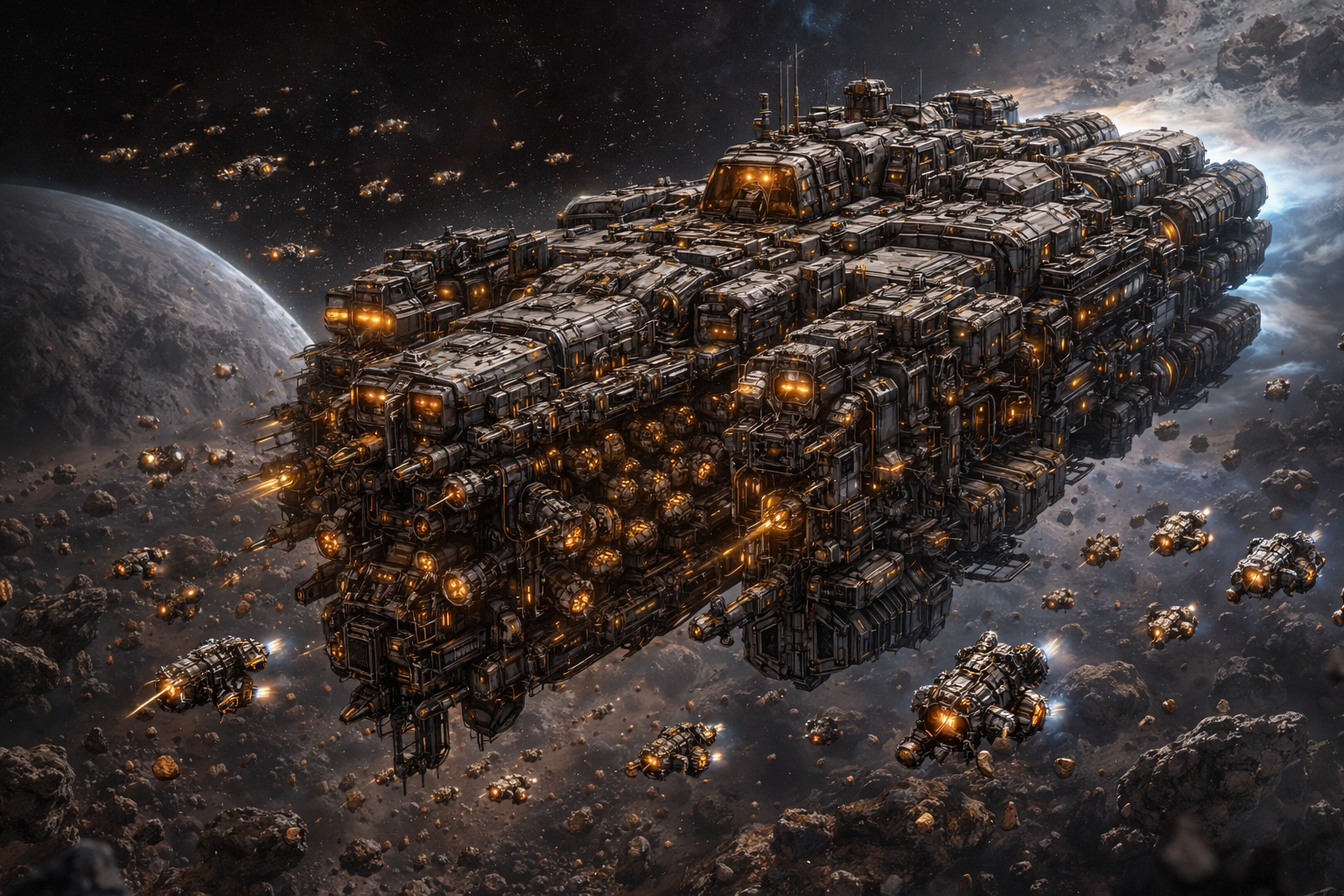 Rather than relying solely on crewed vessels, the Hold deploys swarms of autonomous mining and salvage drones.